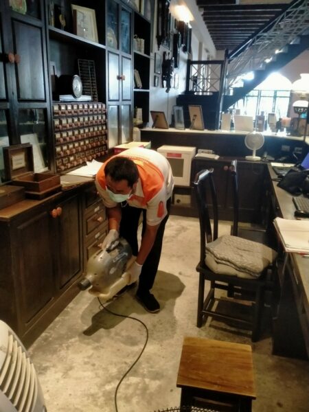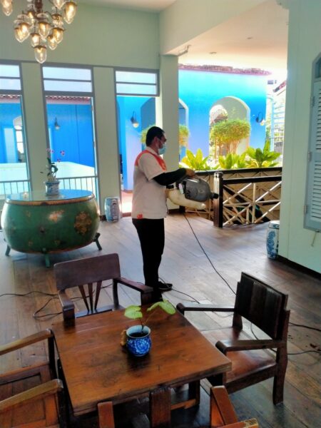 อบละอองภายในห้องพักด้วยพ่น ULV (Ultra-low volume) สเปรย์สารเคมีบริเวณกำแพง ผ้าม่าน,เฟอร์นิเจอร์ Built-in และบริเวณที่ยุงเกาะ สารเคมีจะมีขนาดเล็กและเกาะติดกับบริเวณที่สารเคมีสัมผัส