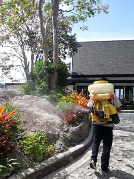 - สเปรย์สารเคมี กำจัดยุง ด้วยเครื่อง ULV (Ultra-low volume sprayer) บริเวณต้นไม้ และแหล่งที่ยุงเกาะพัก